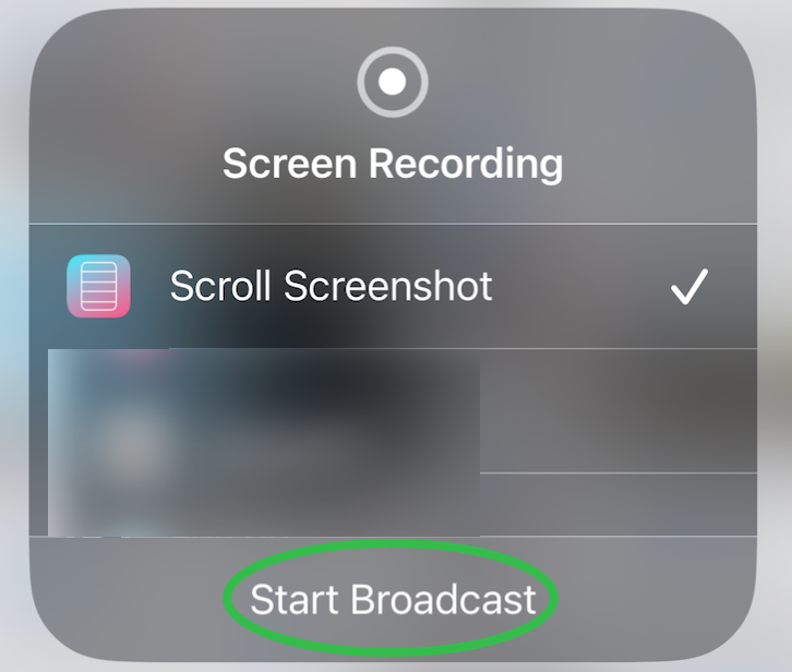 Check **Scrolling Long Screenshot**, tap **Start Broadcast**, and immediately return to the page you want to capture.